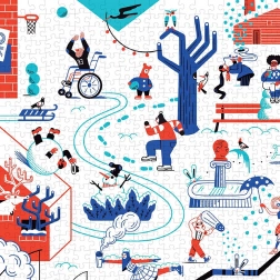 Slagalica nudi vedar pogled na zimski svijet pun aktivnosti poput skijanja i klizanja.