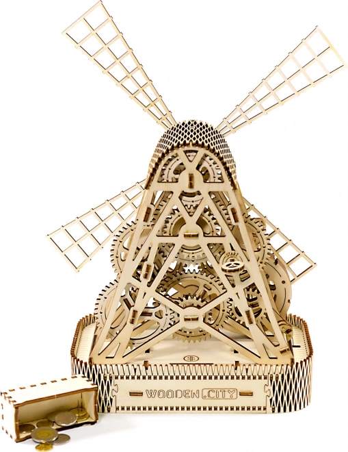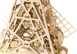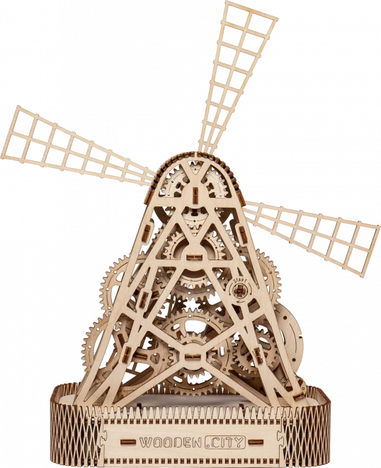 Nakon navijanja gumenim pogonom, lopatice mlina počinju se okretati, a zahvaljujući zamašnjaku među zupčanicima, uživat ćete u zabavi do jedne minute po jednom navijanju. Integrirana kutija u postolju nudi praktičnu upotrebu kao kasica ili spremište za sitnice.