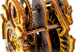 Model je izrađen od ekološke breze šperploče i sklapa se bez ljepila ili alata. Tijekom slaganja upoznat ćete principe prijenosa, gumenog motora i rada satnog mehanizma iz neposredne blizine.