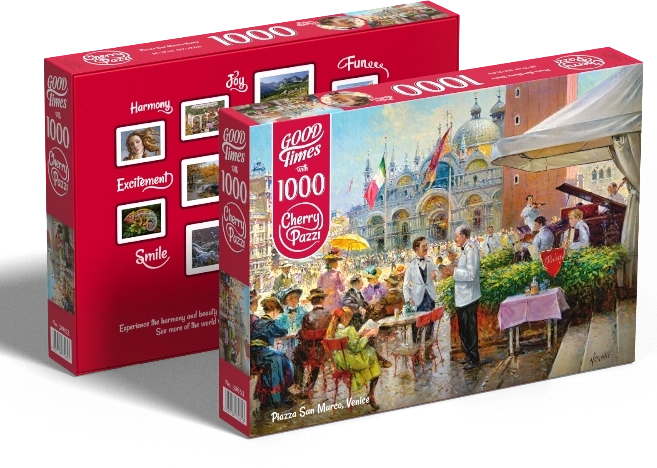 Uživajte u opuštanju i ugodnom izazovu sa slagalicom CHERRY PAZZI koja će vas prenijeti na kultni trg Piazza San Marco u srcu Venecije. Zahvaljujući živim bojama, kvalitetnom tisku i preciznim izrezima, dijelovi savršeno pristaju, a slaganje je glatko i zabavno.