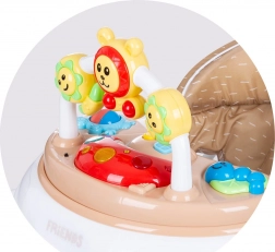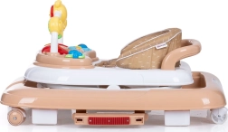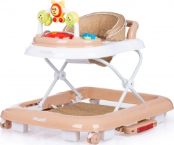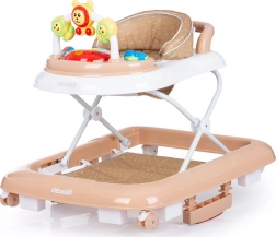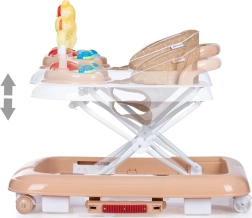 Interaktivni panel sa šarenim igračkama i glazbenom pločom podržava razvoj osjetila i fine motorike. Sjedalo se može namjestiti u 3 razine visine, prednji kotači okreću se 360° za lako manevriranje, a cijela se hodalica jednostavno sklapa i sprema.