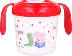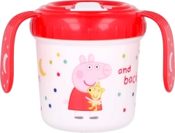 Šalica s ručkama Peppa Pig osmišljena je za malu djecu koja uče piti. Njezin poklopac s usnikom sprječava prolijevanje napitka, a šarene slike s omiljenim likom iz crtića čine pijenje zabavnijim.