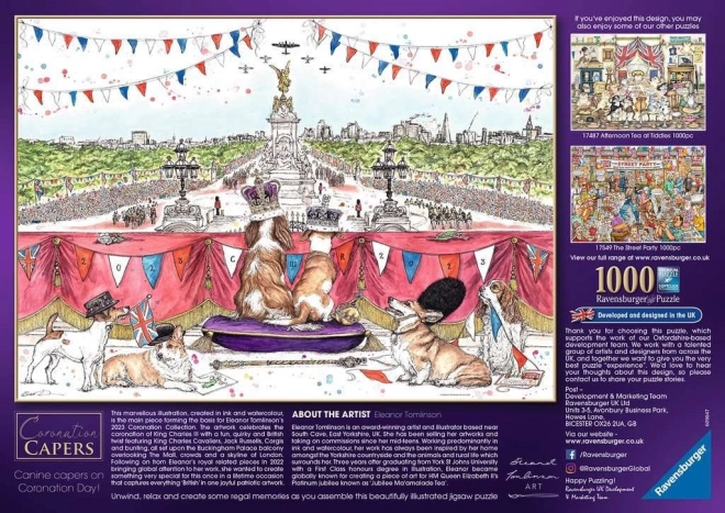 Zadivljujuća slagalica "Coronation Capers" donosi jedinstvenu priliku doživjeti britansku kraljevsku tradiciju iz udobnosti doma. Djelo umjetnice Eleanor Tomlinson bogato je detaljima i nudi pogled na King Charles španijele, Jack Russell terijere, korgije i druge elemente povezane s krunidbom.