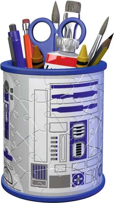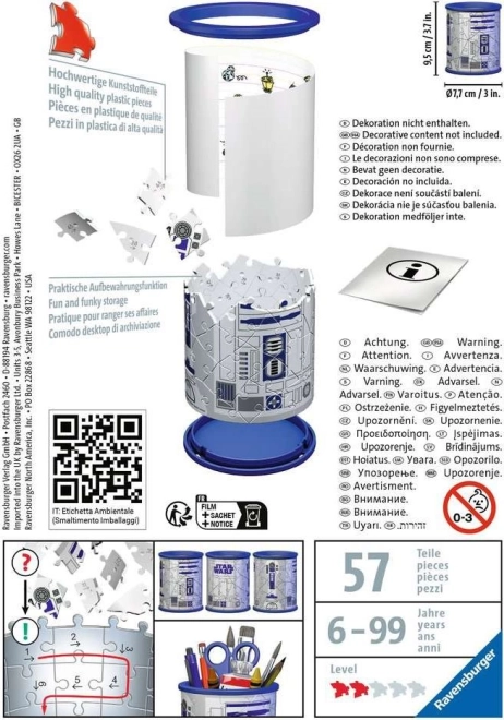 Prestanite tražiti olovke po cijelom stolu! Ovaj RAVENSBURGER 3D puzzle držač Star Wars predstavlja praktičan i istovremeno zabavan način organizacije. Može se slagati prema motivu za zahtjevnije ili prema numeraciji na stražnjoj strani dijelova. Zahvaljujući posebnim zakrivljenim dijelovima od kvalitetne plastike, ovaj držač donosi ne samo lijep dizajn, već i čvrstu stabilnost bez potrebe za lijepljenjem.