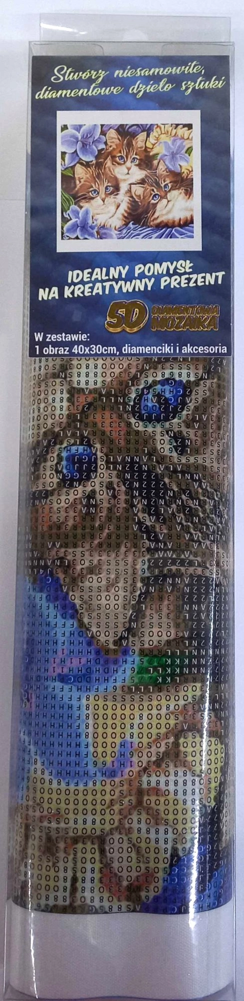 Pakiranje sadrži: platno s prethodno otisnutom slikom, olovku za aplikaciju kamenčića, posudicu za istresanje kamenčića, vosak za lijepljenje, set šarenih kamenčića.