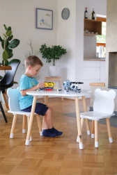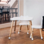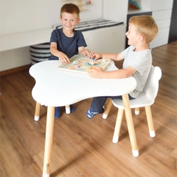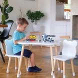 Ovaj moderan drveni set u bezvremenskoj kombinaciji bijele i prirodnog drva lijepo će se uklopiti u svaku dječju sobu ili igraonicu. Zaobljene linije i razigran izgled s medinim ušima potiču dječju maštu, dok robusni materijali osiguravaju dug vijek trajanja i lako čišćenje.