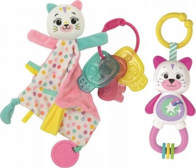 Preslatko poklon pakiranje za najmlađe sadrži mekanu dekicu-uspavljivač, šareno zveckalo i silikonsku grickalicu. Idealno kao prva igračka – potiče umirenje, razvoj osjetila i motorike, a izrađeno je od sigurnih i kvalitetnih materijala.