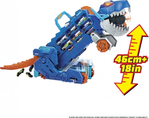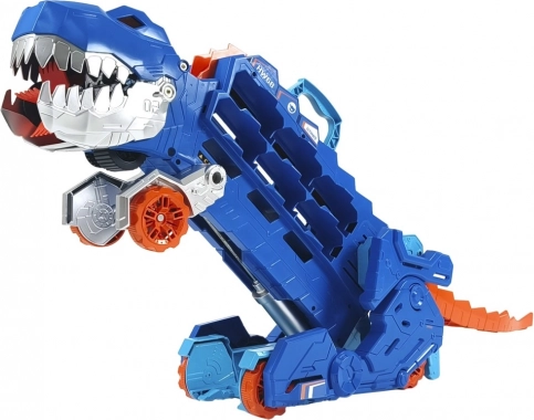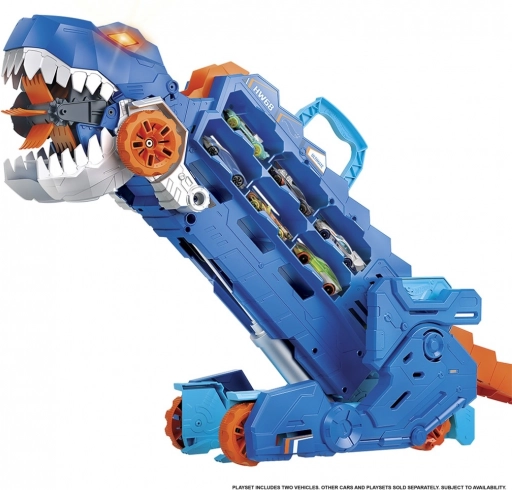 Jedinstveni dinosauri transporter spaja spremište za više od 20 metalnih autića s akcijskom igrom. U režimu transporter dovoljno je povući za ručku i gledati kako T-Rex “proždire” autiće na svom putu. Jednim pokretom repa pretvaraš ga u mehaničkog T-Rexa sa svjetlosnim efektima i dinosaurskim zvukovima.