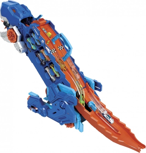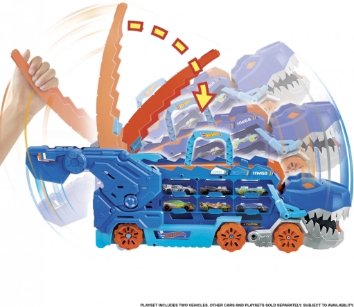 Na leđima T-Rexa nalazi se dvotračna trkaća staza za napete dvoboje. Pobjednik nastavlja vožnju, dok je poraženi “izbačen” od dinosaura – idealno za natjecateljsku igru. Autiće je moguće ispaljivati izravno iz čeljusti za dodatnu akciju. U pakiranju ćeš pronaći 2 HOT WHEELS autića 1:64, pa zabava počinje odmah.