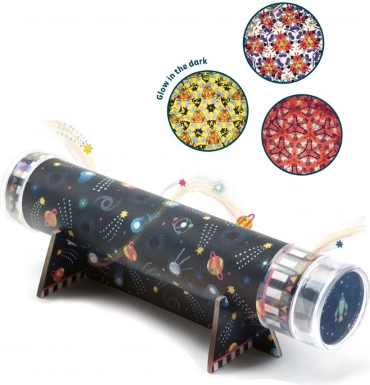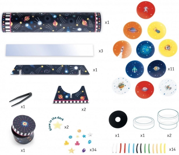 S kreativnim kompletom DIY svemirski kaleidoskop djeca mogu sama sastaviti vlastiti kaleidoskop i otkriti čaroliju optičkih iluzija. Zahvaljujući izmjenjivim pločicama s motivima svemira, svaki put ih čeka nov vizualni doživljaj. Set razvija kreativnost, strpljenje i donosi radost otkrivanja optičkih efekata.