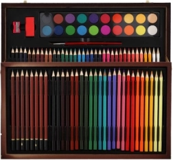 Otkrijte kompletnu umjetničku opremu, idealnu za male i veće umjetnike. Ovaj praktični set u elegantnom drvenom kovčežiću nudi sve potrebno za slikanje i crtanje, uključujući bojice, šiljilo, gumicu i vodene boje, ukupno 91 komad.