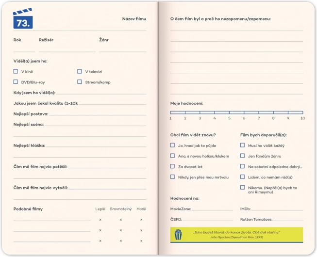 Odlično služi za zapisivanje ocjena, omiljenih citata i prijedloga za nove filmove. Zahvaljujući zabavnim punchlineovima i ilustracijama filmskih junaka, motivirat će vas na stvaranje i vraćanje omiljenim trenucima.