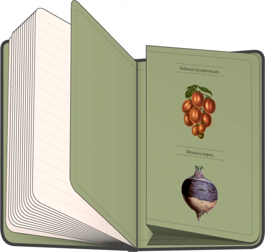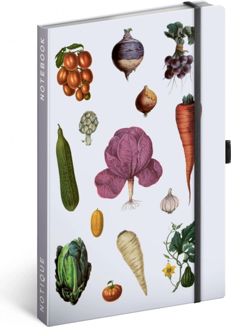 Bilježnica s tvrdim koricama iz kolekcije Kateřine Winterové s ilustracijama raznolikog povrća, s elastičnom trakom za zatvaranje, džepom za sitnice i držačem za olovku. Unutra se nalazi 172 crtane stranice na žutom papiru za zapis svih vaših ideja.