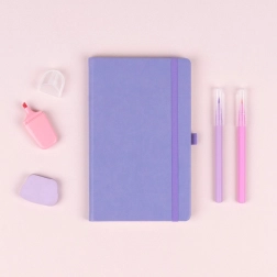 Stilizan linirani notes u trendi lila boji idealan je za svakodnevne bilješke i planiranje. Nudi tvrdi knjižni uvez, elastičnu traku, petlju za olovku i tekstilnu oznaku. Kvalitetan žuti papir s linijama od 6 mm osigurava ugodno pisanje i reprezentativan izgled. Sjajan izbor i za branding s utisnutim logotipom.