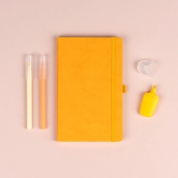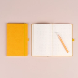 Praktična i lagana točkasta bilježnica u trendi žutoj boji ima površinu s finom teksturom na koju možete utisnuti logotip tvrtke. Bilježnica ima tvrdi uvez i zaobljene kutove, petlju za olovku, elastičnu gumu i tekstilnu oznaku. Točke su razmaka 5 mm i nalaze se na kvalitetnom žutom papiru.