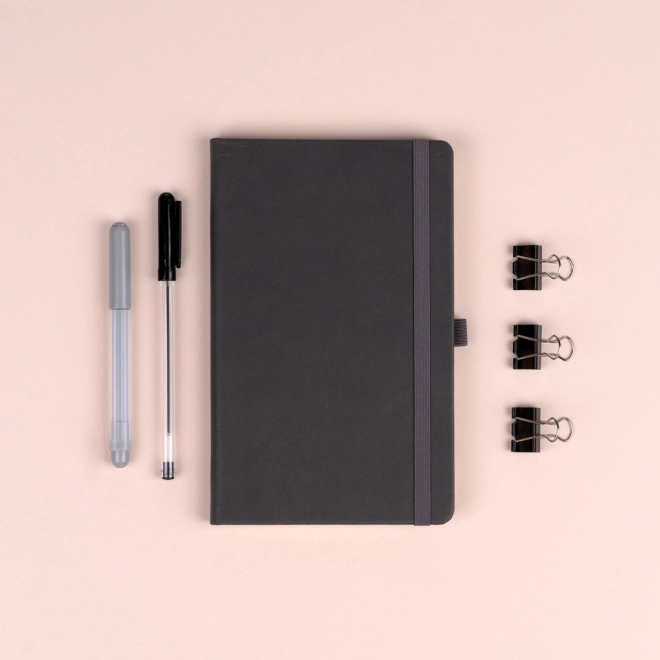 Ova stilska siva bilježnica savršen je izbor za svakodnevne bilješke, planiranje i journaling. Tvrde korice s blagom grubom teksturom djeluju profesionalno i pouzdano štite sadržaj. Praktični detalji poput elastične trake, tekstilne oznake i petlje za olovku omogućuju udobnu uporabu kod kuće, u uredu i na putu.