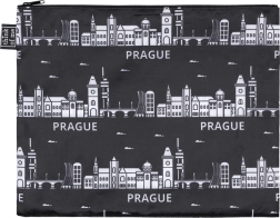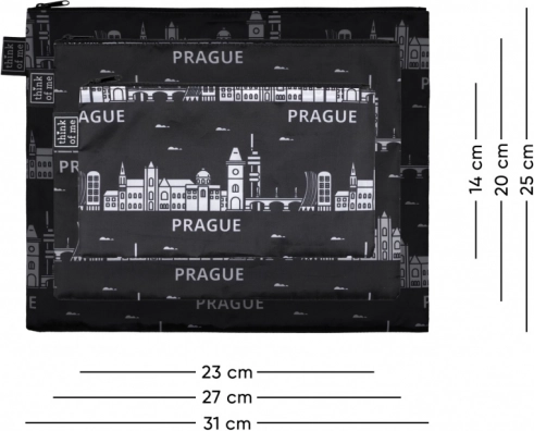 Svaka torbica ima praktično gornje zatvaranje na patentni zatvarač i kontrastni tisak s panoramom PRAGA. Zahvaljujući crnoj boji i bezvremenskom dizajnu lako ih uskladite s bilo kojom prtljagom. Set je odličan i kao stilski suvenir ili poklon ljubiteljima grada.
