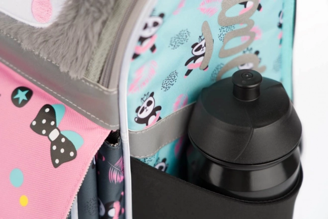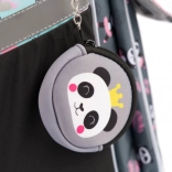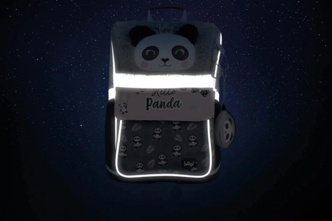 Dio seta je i klasična jednoslojna pernica s dva preklopa i kvalitetnim patentnim zatvaračem te praktična vrećica od čvrstog, perivog materijala s prednjim džepom na patent. Cijeli set krasi popularni motiv pande i dopunjen je sigurnosnim reflektirajućim elementima za bolju vidljivost.