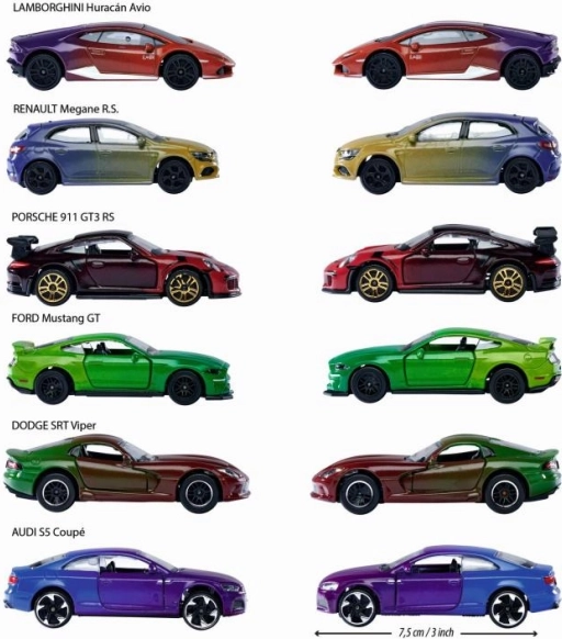 Birajte među modelima PORSCHE 911 GT3 RS, LAMBORGHINI HURACÁN, AUDI S5 COUPÉ, FORD MUSTANG GT, DODGE SRT VIPER i RENAULT MEGANE R.S. – svaki u atraktivnim nijansama i s efektom Color Changers.