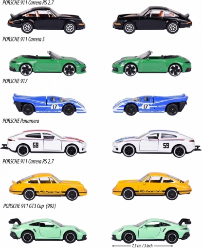 U ediciji se nalazi miks šest legendarnih vozila: Porsche 911 Carrera S (zelena), Porsche 917 (plava), Porsche 911 Carrera RS 2.7 (crna i žuta), Porsche 911 GT3 Cup (992) (tirkizna) i Porsche Panamera (bijela). Sadržaj pakiranja je nasumičan – konkretan model nije moguće odabrati. Svaki autić dugačak je približno 7,5 cm i dolazi s kolekcionarskom karticom s informacijama poput brzine i broja cilindara.