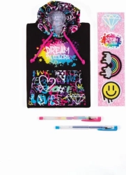 Blok s kapuljačom u graffiti stilu savršen je za djevojčice od 6 godina koje žele izraziti svoju kreativnost. Ovaj moderni blok idealno je mjesto za zapisivanje doživljaja, tajnih snova ili planova za avanture. Dolazi s dvije olovke, naljepnicama i ljepljivim zakrpama koje vam omogućuju personalizaciju svakog bilježenja.