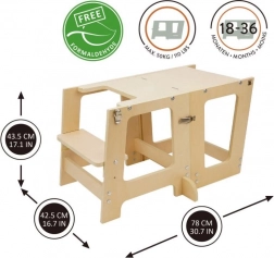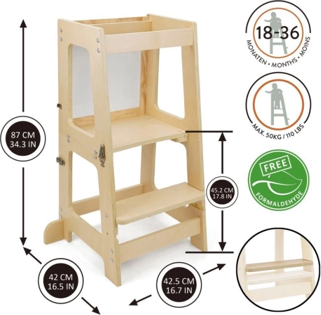 Prema 3u1 učeća kula izrađena je od visokokvalitetne i izdržljive šperploče, koja nudi jednostavno sastavljanje i dugotrajnost. Ima 2 razine visine (16,5 cm i 22,5 cm), kako bi se lako prilagodila rastu vašeg djeteta.