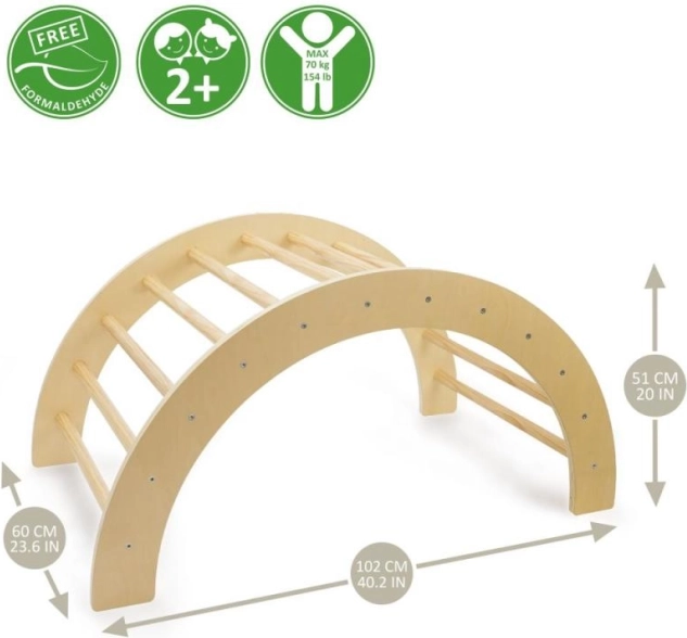 Luk je izrađen od kvalitetne prirodne šperploče koja je potpuno bez formaldehida, što osigurava sigurnost za djecu. Njegova maksimalna nosivost je 70 kg, što omogućuje sigurno korištenje. Montaža je jednostavna i brza – možete je izvesti pomoću jednog priloženog imbus ključa. Proizvod također sadrži razumljive upute za uporabu. Idealan je za djecu od 24 mjeseca.