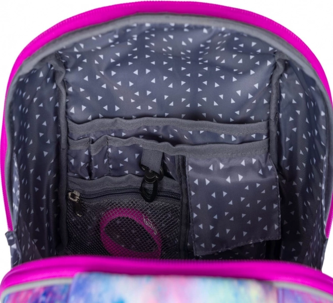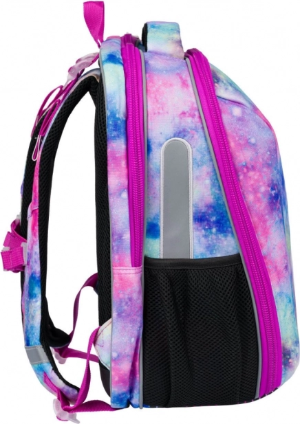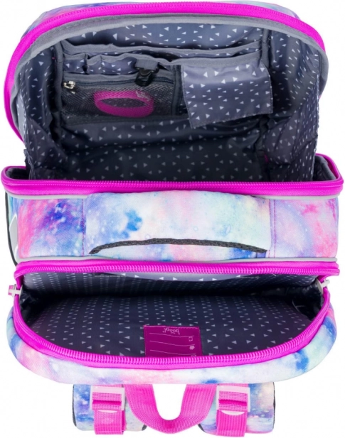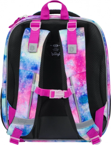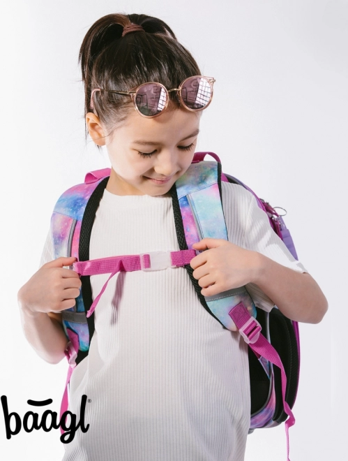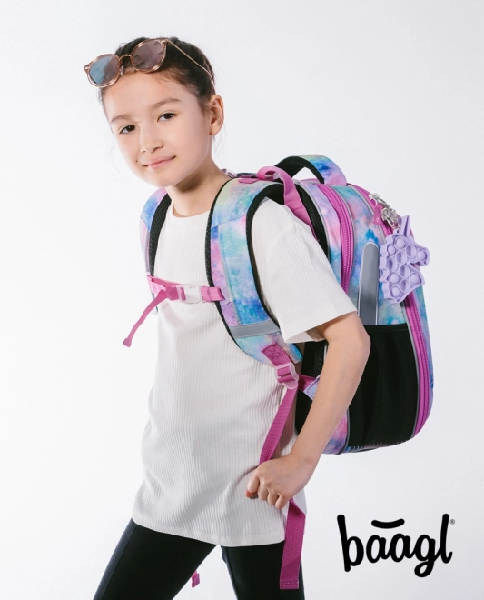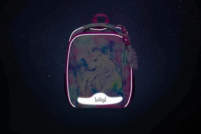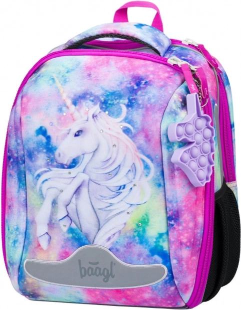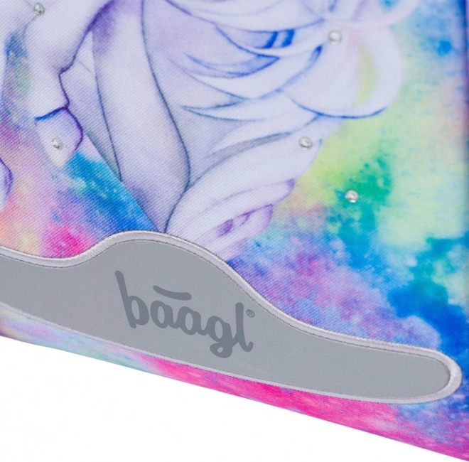 Školska aktovka Baagl Shelly Jednorog odlikuje se pojačanim tijelom, koje štiti sadržaj aktovke poput oklopa. Zahvaljujući dvopregradnom sustavu opterećenje se ravnomjerno raspoređuje, dok prednja pregrada sadrži praktični organizator s džepićem za sitnice i karabiner za ključeve.