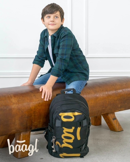 Stilski školski set BAAGL SKATE GOLD sadrži ergonomski ruksak, prostranu pernicu i praktičnu vrećicu. Ruksak nudi 3 komore, džep za 15" prijenosno računalo, trake za skateboard i reflektirajuće elemente. Niska masa 850 g, volumen 25 l i vodootporan materijal jamče udobnost i izdržljivost za svaki školski dan.