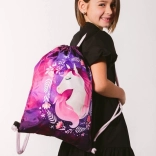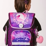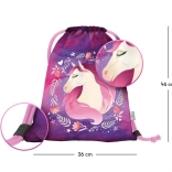 Stilski školski set s motivom konja za male školarce od 1. razreda uključuje ergonomsku aktovku, prostranu pernicu i praktičnu vrećicu za obuću. Aktovka nudi ergonomski oblikovana leđa i podesivi sustav ERGO ADJUSTABLE SYSTEM za savršeno prilagođavanje, magnetno zatvaranje Fidlock za lako otvaranje, reflektirajuće elemente za sigurnost i nisku masu ispod 1 200 g. Set se ističe kvalitetnom izradom, vodootpornim materijalima i lijepim ljubičasto-ružičastim dizajnom s konjskim motivima.