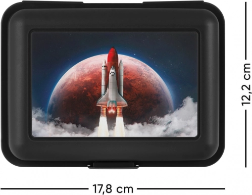 Ova plastična kutija za užinu ima poklopac sa svemirskom tematikom, prikazuje lansiranje raketoplana s planetom u pozadini.