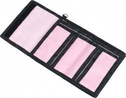Posjeduje nekoliko odjeljaka uključujući prozirni pretinac za kartice i pretinac s patentnim zatvaračem za gotovinu.