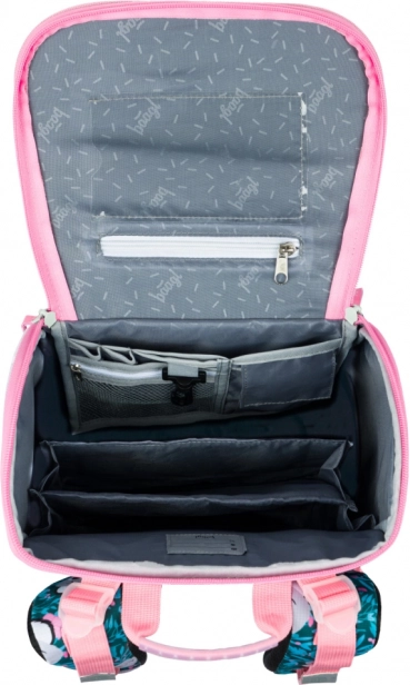 Unutra se nalazi pregledan organizator s gumicom za fiksiranje bilježnica i prozirni džep za raspored. Bočni džepovi od čvrste mrežice primaju bocu za piće, prednji izolirani džep s kopčom čuva užinu na sigurnom. Vodootporni materijali, čvrsto dno za samostalno stajanje i reflektirajući elementi povećavaju izdržljivost i sigurnost.