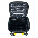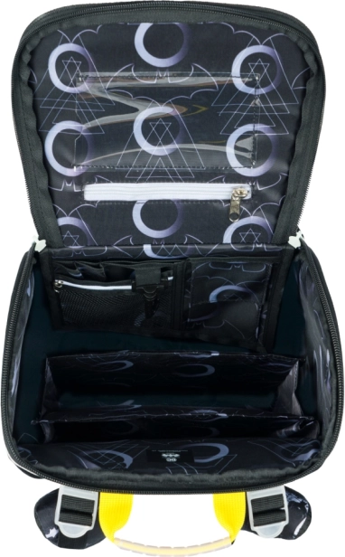 Praktično preklopno otvaranje omogućuje pristup sadržaju aktovke izravno iz klupe. Unutra se nalaze prozirni džep za raspored i organizator s elastičnom trakom za pregledno spremanje udžbenika i bilježnica. Izolirani prednji džep s kopčom štiti užinu, bočni mrežasti džepovi primaju bocu za piće. Čvrsti vodoodbojni materijali, stabilno dno i reflektirajući elementi povećavaju izdržljivost i sigurnost na putu do škole.