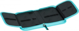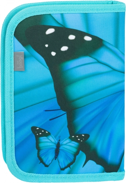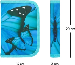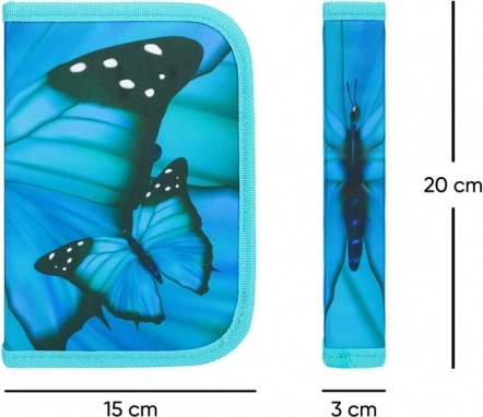Elegantna pernica u turkizno plavoj boji s izraženim motivom leptira spaja stil i funkcionalnost. Zahvaljujući dvjema unutarnjim preklopnim stranicama, gumenim držačima i džepovima, pisani pribor i sitni školski dodaci uvijek su pregledno posloženi i sigurno zatvoreni patentom.