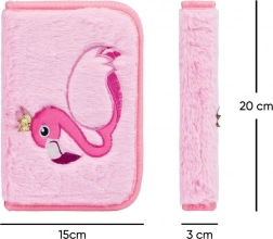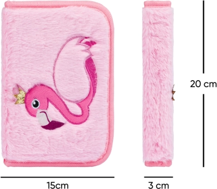 Praktična i dizajnerska školska pernica s motivom plamenjarke oduševit će mekom površinom i promišljenom organizacijom. Jednopregradno rješenje s dva preklopa omogućuje pregledno spremanje pribora za pisanje, ravnala i sitnih školskih potrepština. Izdržljiv patentni zatvarač osigurava pouzdano zatvaranje i lako otvaranje.