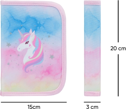 Stilsku školska pernica s motivom jednoroga Rainbow Unicorn od BAAGL-a oduševit će svakog školarca. Nudi pregledan raspored zahvaljujući dvjema preklopnim stranicama, kvalitetan patentni zatvarač i izdržljivo tekstilno izvedenje. Idealna za svakodnevnu upotrebu u školi – praktična, lagana i bez punjenja za vlastiti odabir pribora za pisanje.