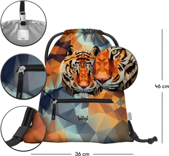 Praktična vrećica s motivom tigra marke Baagl, idealna za slobodno vrijeme ili kao vrećica za obuću, nudi jednostavno prenošenje zahvaljujući podesivim uzicama i praktičnom džepiću na patentni zatvarač za organizaciju predmeta.