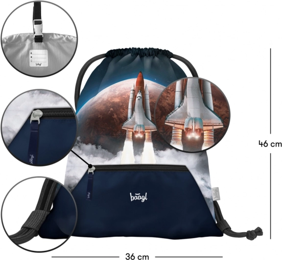 Vrećica BAAGL Space Shuttle savršeno nadopunjuje školsku opremu zahvaljujući karabineru koji omogućuje pričvršćivanje na školsku torbu. Izrađena je od čvrstog materijala koji osigurava dugu trajnost i jednostavno održavanje. U donjem dijelu vrećice nalazi se praktičan džepić s patentnim zatvaračem za spremanje sitnica.