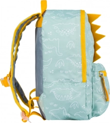 Upadljiv tirkizni ruksak s veselim dinosaurovim uzorkom i razigranim detaljima privlači na prvi pogled i potiče radost svakodnevnog nošenja.