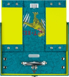 Stilska školska kutija s motivom T‑REX od čvrstog laminiranog papira nudi sklopivu konstrukciju na drukere, izdržljive okove s ojačanim kutevima i metalnu ručku za udobno nošenje. Sigurno zatvaranje na kopču štiti sadržaj, a upečatljiv tirkizno‑žuti dizajn oduševit će svakog školarca.