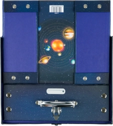 Stilna i praktična školska aktovka s motivom svemira, koja se zahvaljujući drukerima lako sklapa i rasklapa. Izrađena je od čvrstog laminiranog papira s okovanim kutovima, ima metalnu ručku i pouzdanu kopču za sigurno zatvaranje.