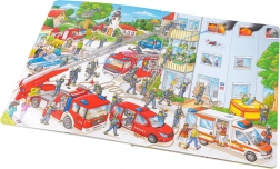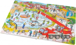 Ova velika slikovnica vodi male čitatelje u akcijski svijet vatrogasaca. Djeca će vidjeti kako se priprema izlazak na teren, kako funkcionira duga ljestva, šmrkovi i druga oprema te kako izgleda spašavanje ljudi iz zapaljenih kuća. Ilustracije su bogate detaljima i potiču na pripovijedanje priča.