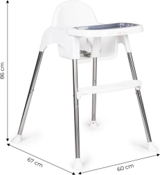 Moderna dječja hranilica 2u1 izrađena je od kvalitetnog materijala. Stolica je prikladna za djecu od 6 do 36 mjeseci. Može se sastaviti u dvije visine. Prednosti hranilice: udobno sjedalo s prečkom protiv klizanja, 5-točkasti sigurnosni pojasevi, stabilne protuklizne nogice, praktična podnožica, odvojivi plastični poslužavnik. Dimenzije sklopljene stolice su cca 86 x 67 x 60 cm. Maksimalna nosivost je 15 kg.
