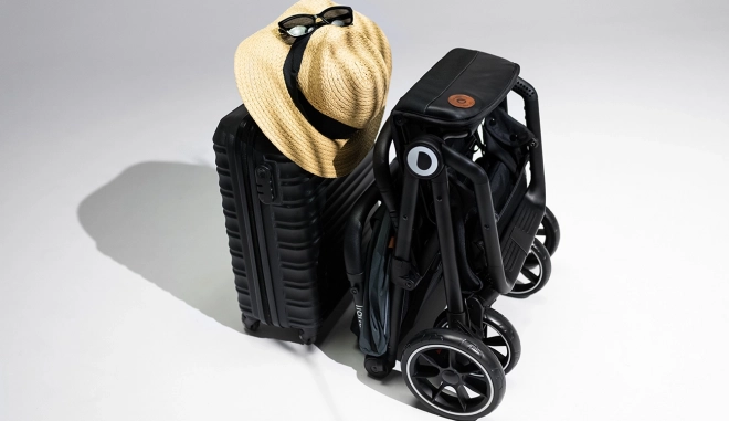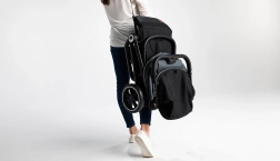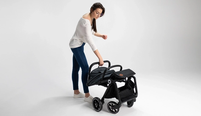 XXL tenda s vodonepropusnom obradom i filtrom UPF50+ pruža pouzdanu zaštitu od sunca i kiše. Sigurnost osiguravaju 5-točkovni pojasevi i reflektirajući elementi za bolju vidljivost. Pritiskom na gumb kolica se automatski sklapaju u kompaktan oblik – lako ih je prenijeti pomoću posebnog remena i zaštitne navlake.
