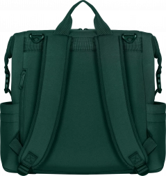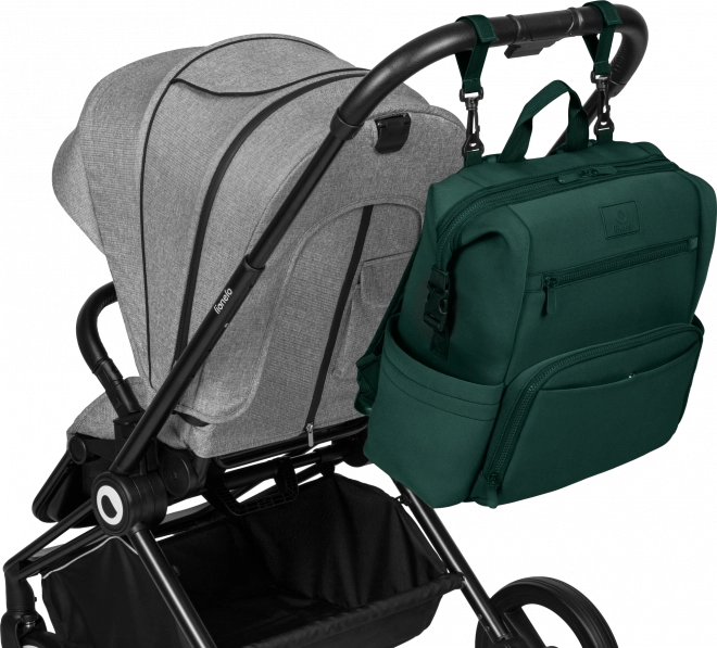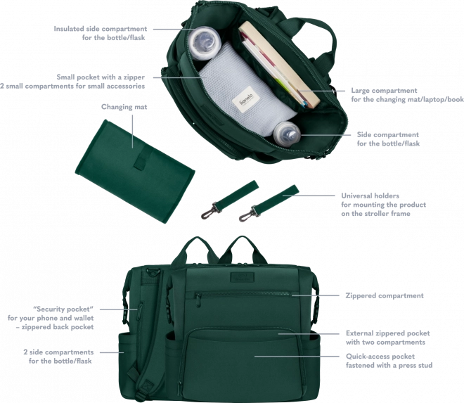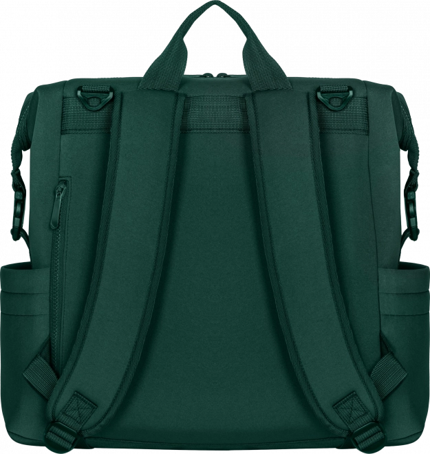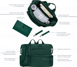 Ruksak se može nositi na leđima, pričvrstiti na kolica pomoću odvojivih univerzalnih kopči ili koristiti kao samostalni dodatak. Džep za presvlačenje može poslužiti i kao pretinac za tablet ili prijenosno računalo, dok bočni i unutarnji džepovi drže sve pri ruci. Zahvaljujući kopčama moguće je smanjiti veličinu tako da se ruksak može smjestiti i ispod sjedala u zrakoplovu.