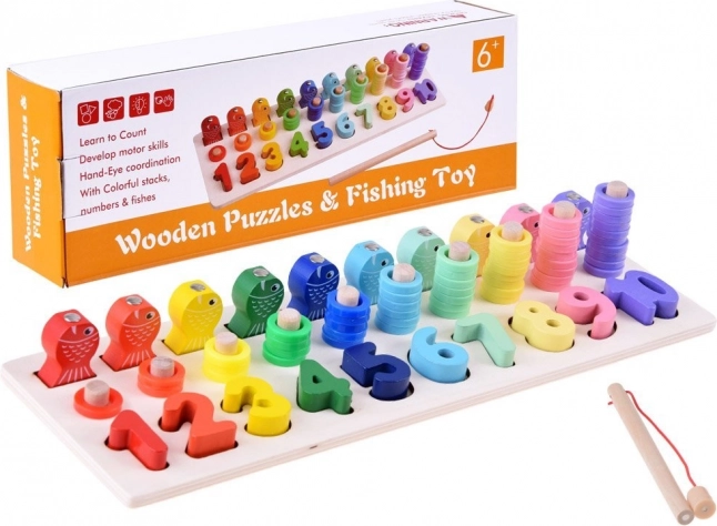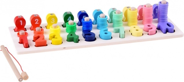 Drveni edukativni set omogućuje djeci prepoznavanje oblika i brojeva te ih uči brojati do deset.