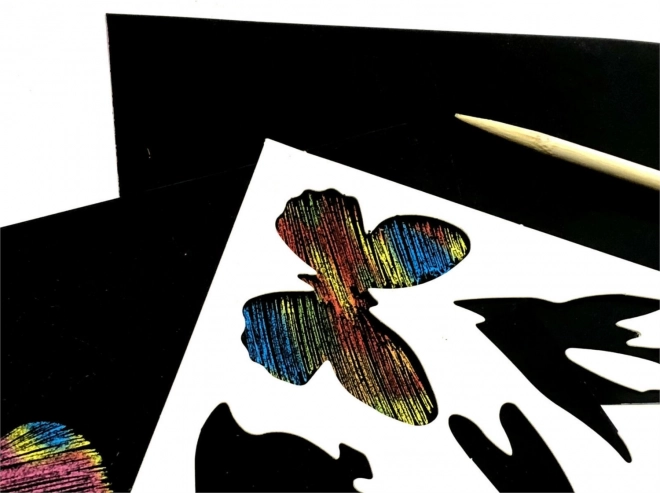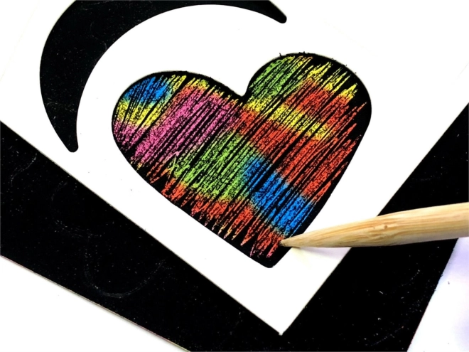 Ovaj kreativni set odličan je za male i velike umjetnike. Crni sloj na papiru skriva šarenu duginu podlogu koja se otkriva struganjem uz pomoć priloženog drvenog stilusa. Zahvaljujući predlošcima lako ćete izraditi čiste oblike i dekoracije – ili se prepustiti slobodnom stvaranju.