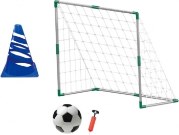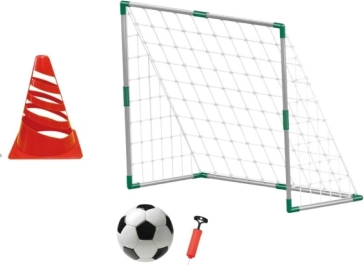 Set uključuje gol s mrežom, nogometnu loptu, pumpicu i trenažni čunj – djeca mogu početi igrati odmah nakon raspakiravanja.