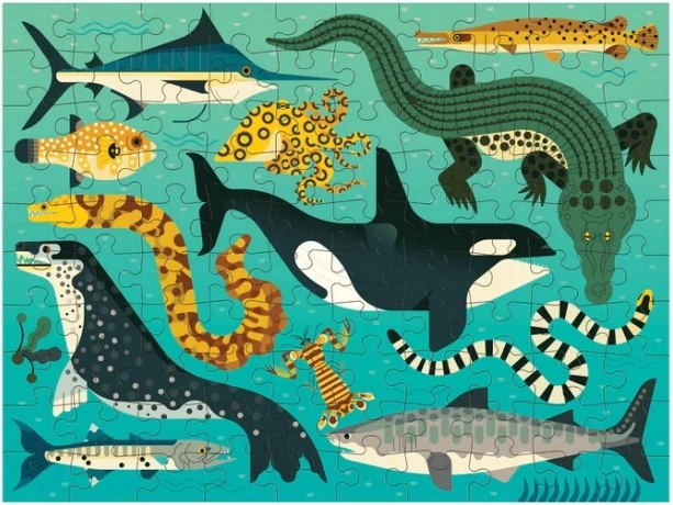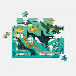 Ova zanimljiva puzzle prikazuje na jednoj strani kopnene predatore, dok na drugoj strani morske lovce dubina. Izrađene od značajnog udjela recikliranog papira, osiguravaju ekološku održivost i sigurnost korištenih boja. Površinska obrada je matirana, što jamči vjerno prikazivanje detalja i boja, a glatka površina stražnje strane sprječava stvaranje prašine tijekom skladištenja.